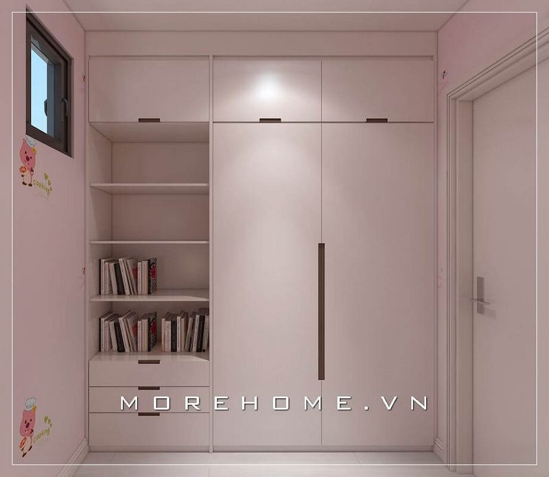 Tủ quần áo màu trắng được thiết kế theo kiểu dáng cửa lùa kết hợp ngay phía hông là phần kệ tủ giúp con có thêm không gian cất giữ đồ dùng của mình