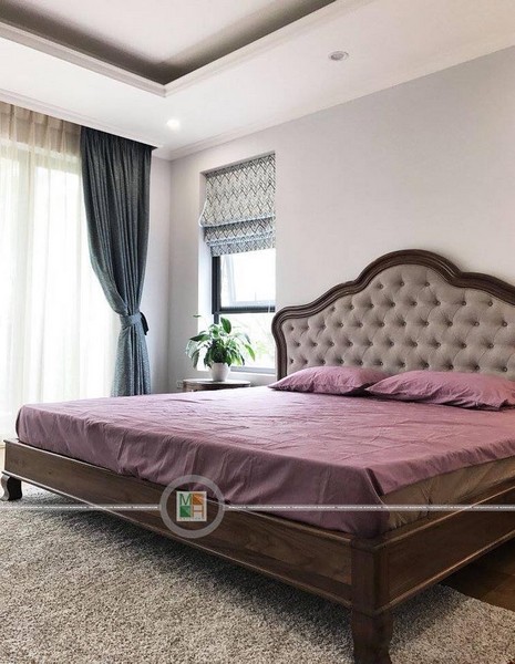 Giường ngủ tân cổ điển gỗ tự nhiên kết hợp đầu giường bọc mềm mại.