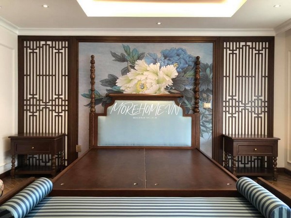 - Giường ngủ Indochina với sự kết hợp tinh tế giữ gỗ tự nhiên và đầu giường bọc.