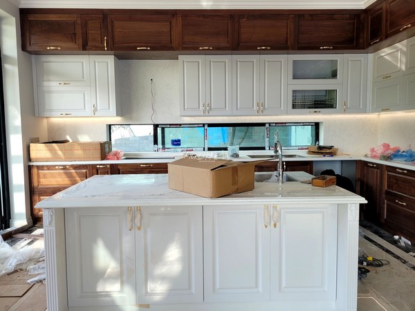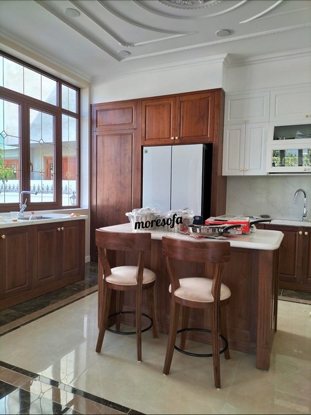 Sự pha trộn tinh tế giữa gam trắng sáng trẻ trung và sắc gỗ tự nhiên mộc mạc tạo nên một tổng thể hài hòa, giúp căn bếp vừa sang trọng vừa gần gũi. Chất liệu gỗ tự nhiên bền chắc kết hợp với lớp sơn cao cấp màu trắng giúp tủ bếp không chỉ đẹp mắt mà còn bền lâu, chống ẩm mốc, dễ dàng vệ sinh trong quá trình sử dụng.