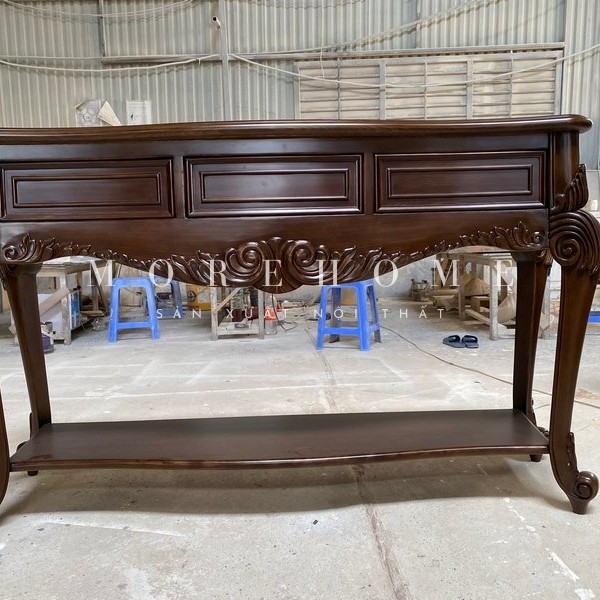 Được chế tác từ gỗ tự nhiên bền chắc, bề mặt được xử lý kỹ lưỡng, phủ lớp hoàn thiện tôn lên vẻ đẹp vân gỗ ấm áp kết hợp cùng những chi tiết bo cong tinh xảo mang đậm dấu ấn tân cổ điển. Nhờ vậy, kệ vừa mang tính thẩm mỹ cao, vừa tạo sự hài hòa cho không gian sống.