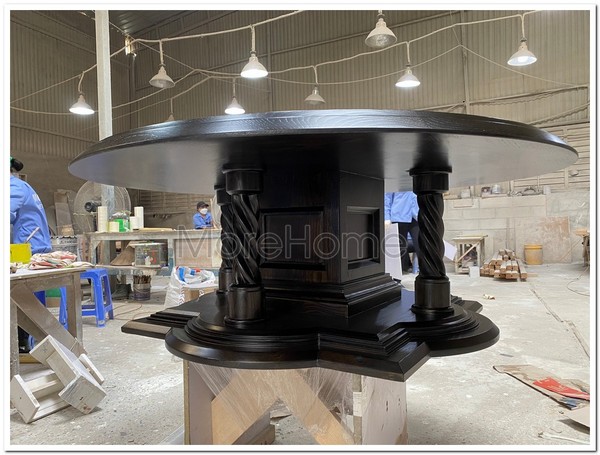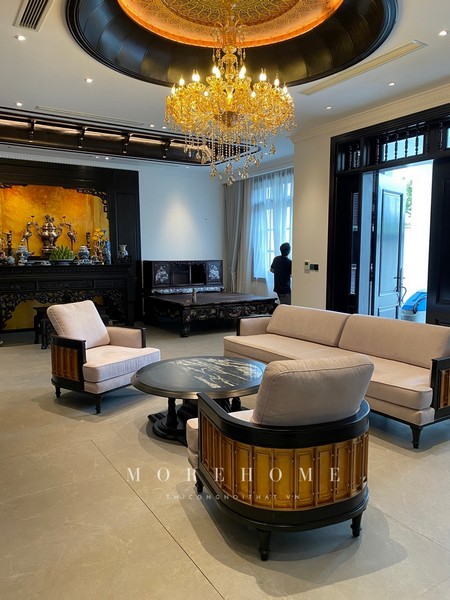 Kết hợp cùng mặt bàn bằng đá với khả năng chống ngấm ố càng tạo nên điểm nhấn cho không gian phòng khách, sản phẩm không chỉ bền chắc mà còn tỏa sáng như trung tâm của không gian tiếp khách. Gam màu  gỗ trầm ấm càng làm nổi bật phong cách tân cổ điển lộng lẫy.