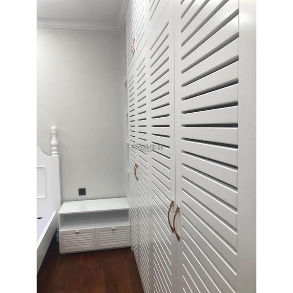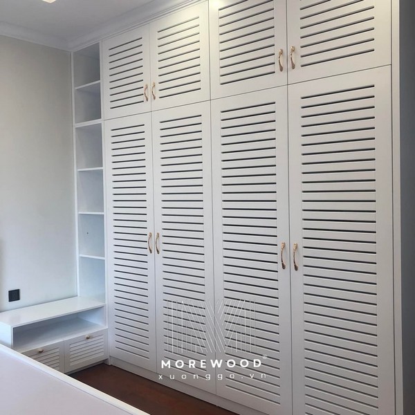 Gam màu trắng thanh lịch kết hợp cùng cánh cửa nan gỗ thoáng nhẹ, tạo nên vẻ đẹp vừa sang trọng vừa gần gũi, giúp không gian phòng ngủ luôn thoáng đãng và hài hòa.