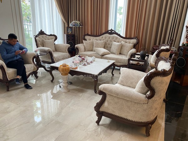 Được chế tác từ gỗ tự nhiên cao cấp, bàn trà mang phong cách tân cổ điển với những đường cong uyển chuyển, chi tiết chạm khắc tinh tế. Từng đường nét mềm mại không chỉ làm nổi bật vẻ đẹp thanh lịch mà còn tạo nên sự sang trọng, cuốn hút cho không gian phòng khách.